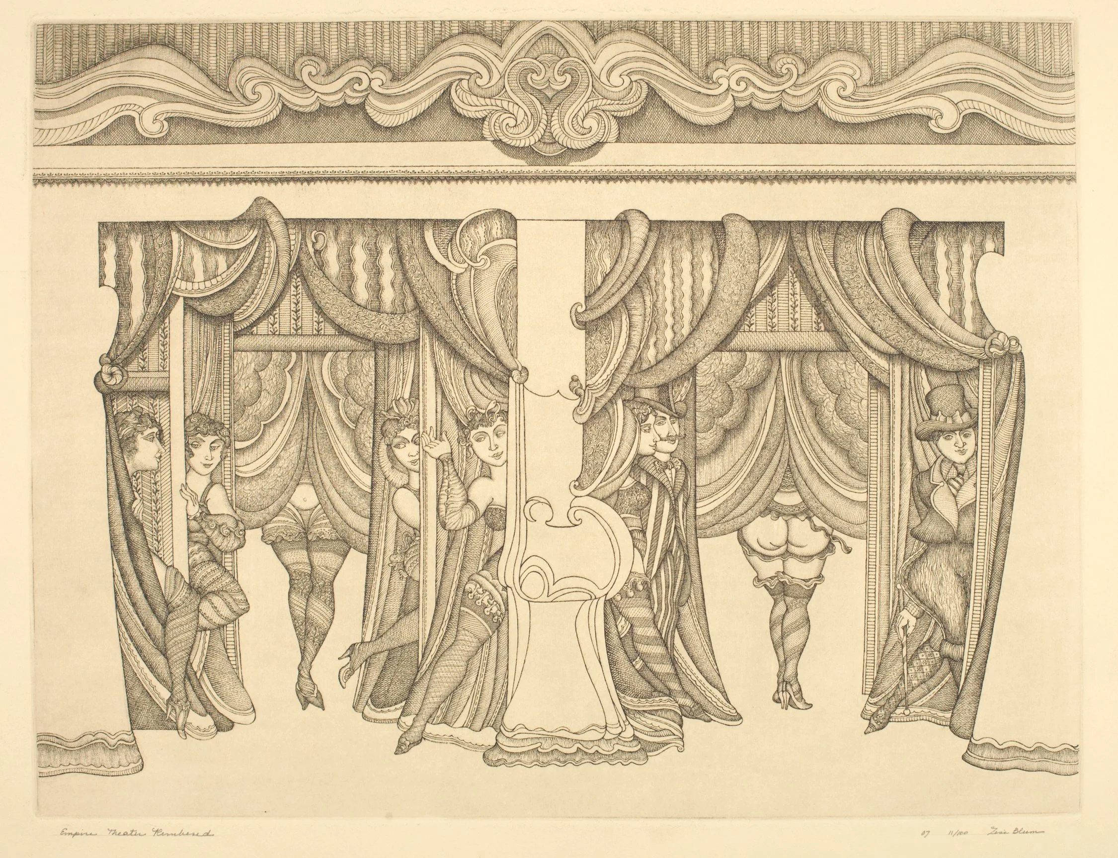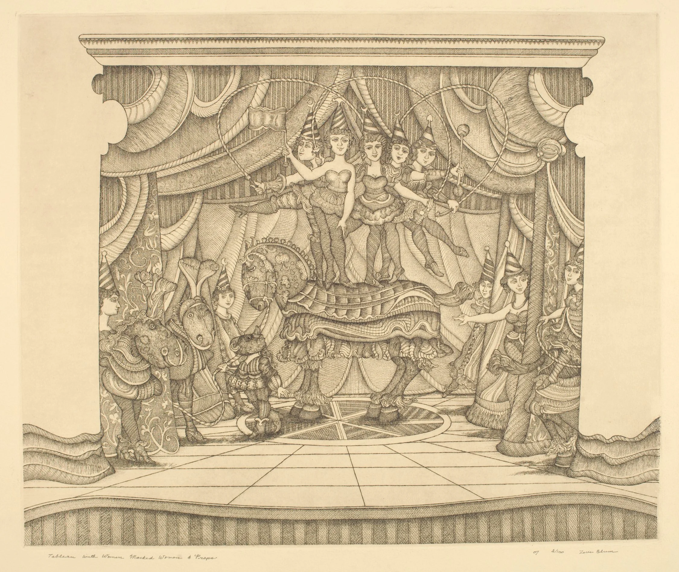 Tableau with Women, Masked Woman and Props Etching Sepia (23.5" x 17.5")